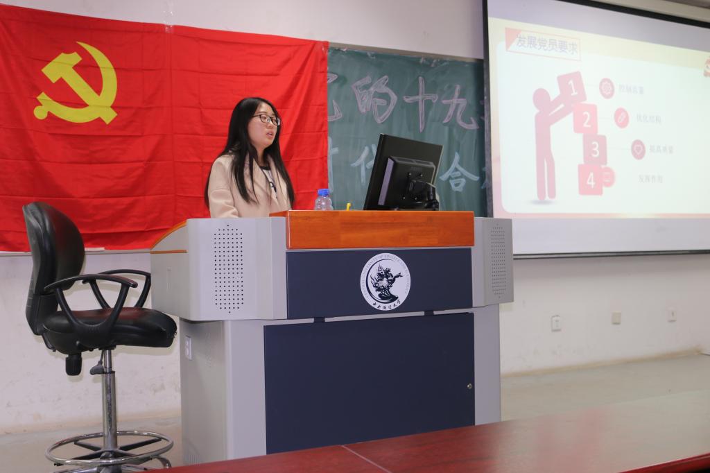 在杨琼老师结束课程之后,本科生第一党支部书记司晴老师简要介绍了入党的准备事项。首先司晴老师着重讲述了入党动机,告诫同学们认真思考自己的动机,不要简单地为了综测、跟风等过于实际的目标,而要正视自己内心对崇高理想的追求,不仅要从行动上入党,更要从思想上先入党。简单一点来说,要能成为更好的自己,要能建设更好的社会。接着,讲解了入党的五步程序,分别是递交入党申请书,团员推优,确定为入党积极分子,确定为发展对象,发展为预备党员,经一年预备期考察成为正式党员。最后,司晴老师介绍了党员丰富的日常活动,包括党员的七个一、两学一做常态化制度化学习、十九大精神学习等等,鼓励大家积极参与学院党委组织的党员活动,积极向党组织靠拢。要成为一名合格的共产党员,应该不断地提升自我,同时也用自己的力量推动集体的进步。