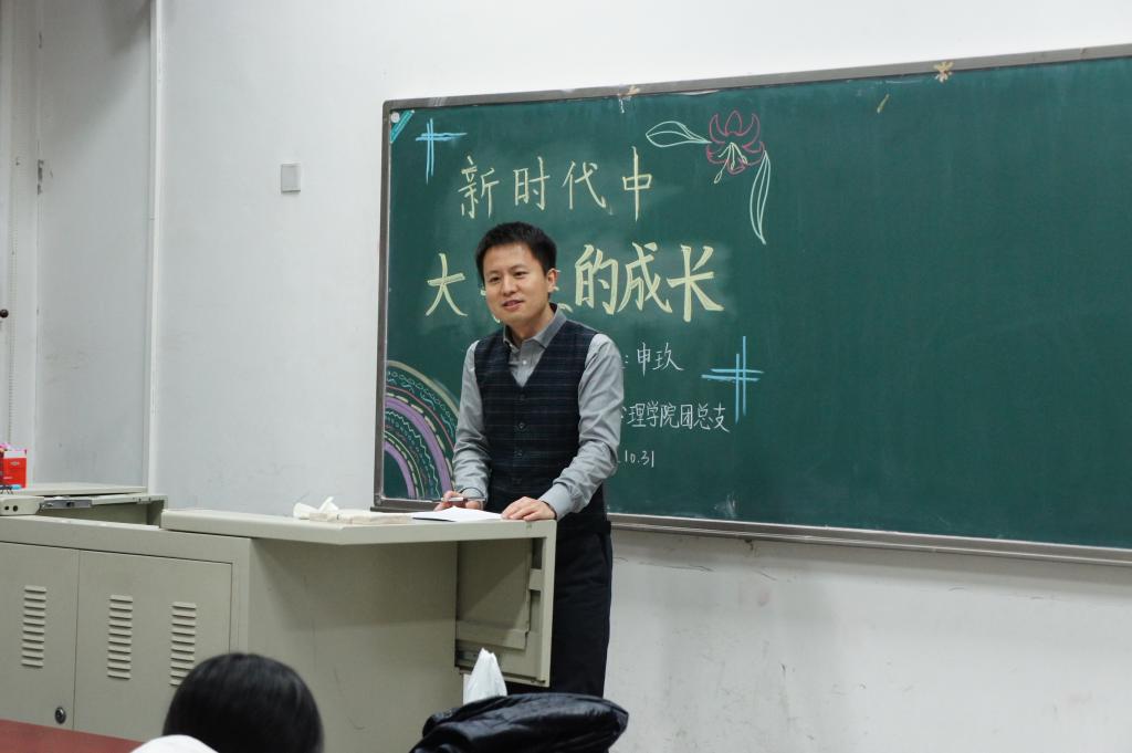 2016年10月31日,大洼迎来了-4℃的低温和中财肆虐的校风,当然,也迎来了一股暖流 ——05级毕业校友申玖学长以幽默诙谐的语言风格,结合自身的经历和体会,做了题为“新时代中大学生的成长”的交流,主要讲述了当今社会的十个变化趋势和十个未变的规律。