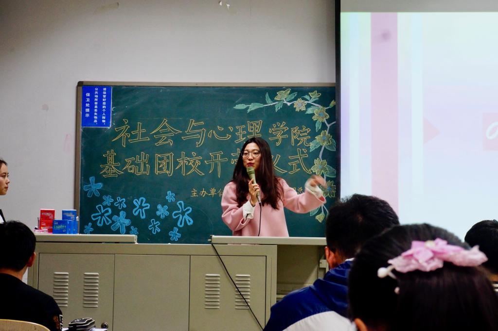 芮+导师孙鹏宇在基础团校开营式讲话中鼓励16级新生积极参与基础团校系列活动,努力学习更多的党团知识,在开阔眼界丰富底蕴的同时收获真挚的友谊,体会合作的乐趣。