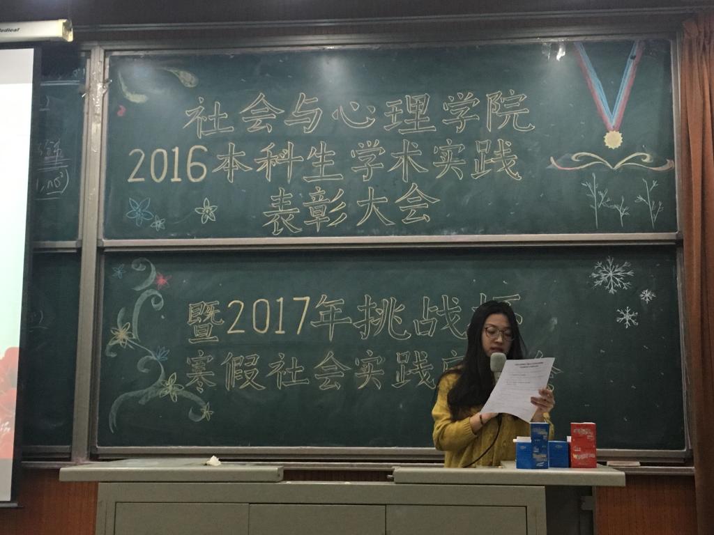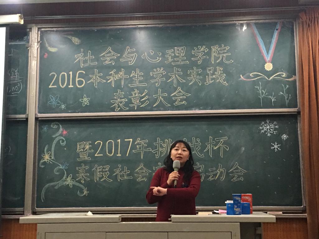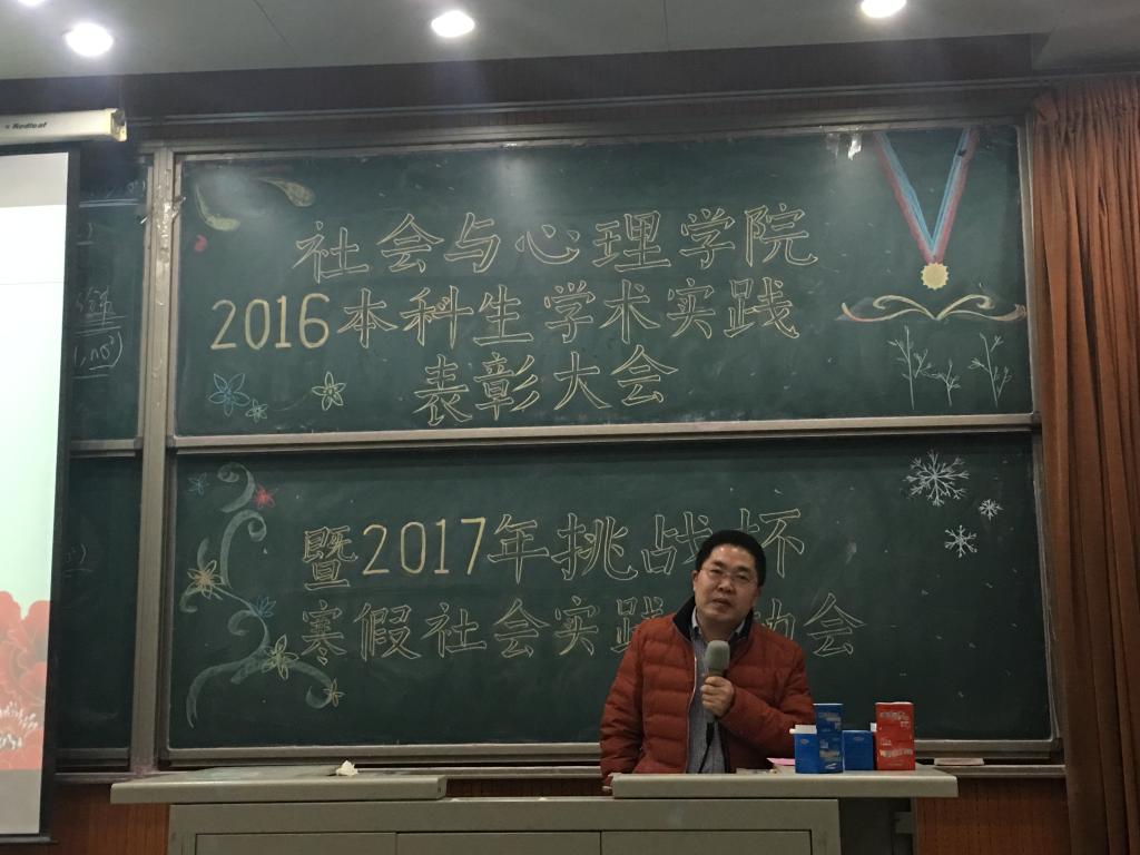 2016年12月23日,3044永利集团官网组织开展了“2016年本科生学术实践表彰大会暨2017年挑战杯、寒假社会实践启动会”,3044永利集团官网党委书记杨琼老师、副院长丁志宏老师、社会学系王建民老师、心理学系张红川老师,学院团总支书记胡博老师,辅导员司晴老师出席了本次会议。