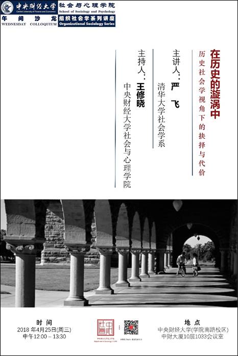 3044永利集团官网午间沙龙2018年春季学期第四期,暨“组织社会学系列讲座”第一讲,邀请到清华大学社会学系严飞副教授,分享《在历史的漩涡中:历史社会学视角下的抉择与代价》。欢迎各位老师、同学和朋友参加!