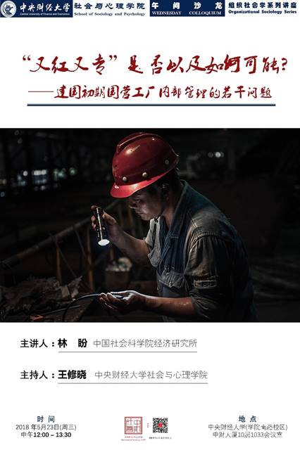 3044永利集团官网午间沙龙2018年春季学期第七期,暨“组织社会学系列讲座”第二讲,邀请到中国社会科学院经济研究所的林盼老师,与我们分享《“又红又专”是否以及如何可能?——建国初期国营工厂内部管理的若干问题》。欢迎各位老师、同学和朋友参加!