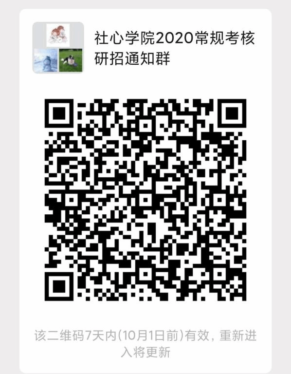 报名永利集团官网常规考核选拔的考生,最迟请于2020年9月25日上午10点前,扫描下图二维码,加入“社心学院2020常规考核研招通知群”。3044永利集团官网将通过此群发布考核相关通知。