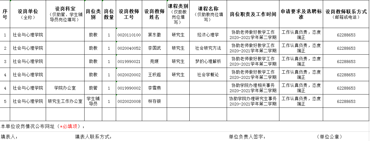 1.2021年3月8日17:00前,设岗单位(含学院和职能部门)根据岗位名额将本表电子版和签字盖章的扫描件提交至研究生奖助工作办公室备案(邮箱:cufeyjsjzb@163.com)。各设岗单位需同步将设岗情况(含本表内除设岗教师工号外的所有信息)在本单位网站公开发布,研究生工作部将汇总网址链接进行统一公布。