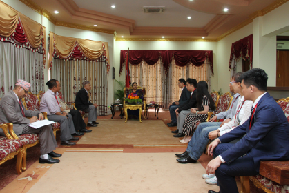 比迪娅总统对代表团一行的到来表示欢迎。比迪娅总统表示,近年来随着尼中友好和经贸往来,尼泊尔政府和民间越来越重视中文教育和学习,越来越多的尼泊尔青年愿意到中国留学,尼泊尔政府对中国政府对尼泊尔留学生的资助表示感谢,欢迎中国年轻人到尼泊尔来访问和学习。比迪娅总统还对中国政府与民间对尼泊尔的大力援助和支持表示感谢,并高度评价了中国民间组织在尼的公益活动。双方还就如何推进中国民间组织在乡村儿童教育、女性发展、减少贫困、增进健康、环境保护等方面开展中尼合作深入交换了意见。