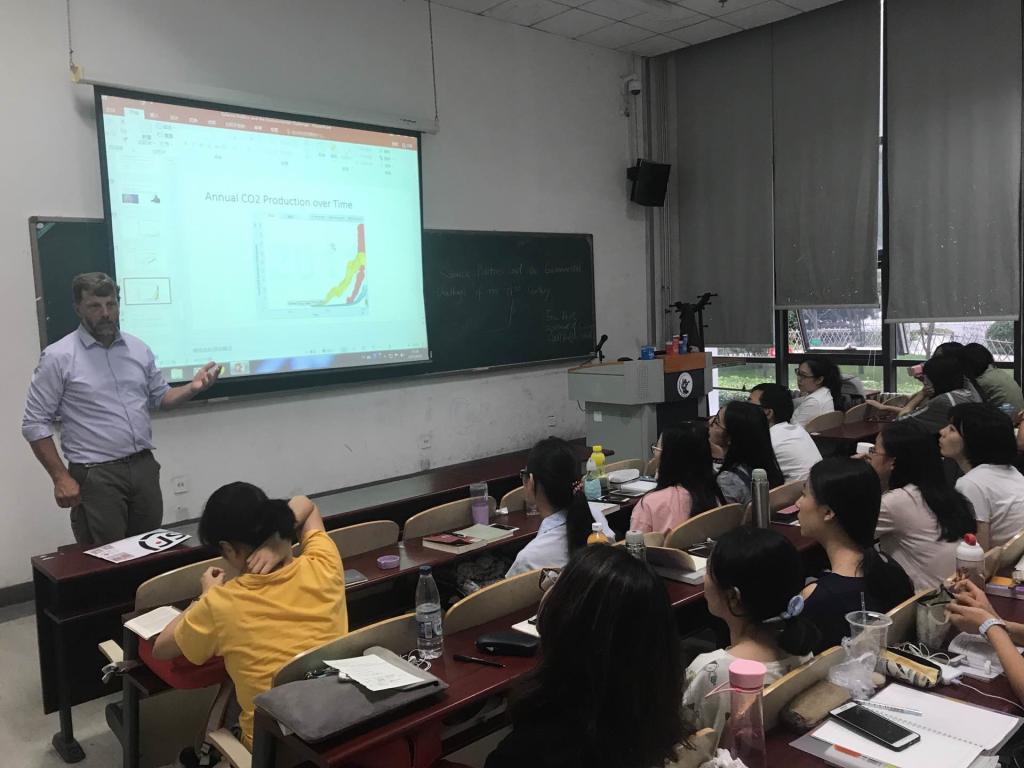Dr. Krieg毕业于美国东北大学(Northeastern University)社会学与人类学系,作为一名资深的社会学家,Krieg教授主要研究环境社会学,还包括社会运动、社会不公平、社区等领域。在“Science, Politics, and the Environmental Challenge of the 21stCentury” 讲座中,Dr. Krieg一开始就指出环境问题是社会问题,我们必须从社会学的角度理解环境问题。他从气候科学、社会成本、比例失调、社会建构的否定和应对气候变化方面阐述了社会学与气候变化的关系。气候科学主要是通过分析环境数据和社会数据分析二氧化碳与全球气温的相辅相成关系;通过列举Boston、 The Andes,、Peru,、Pakistan、 Iceland和 China等案例说明了气候变化导致的社会成本;利用基尼系数表明了权力极不平等反而受到公众的认可,而规范却被视为一种威胁的比例失调;社会建构否定主要是说明为何会出现否认气候变化。最后,他提出,我们应该汲取社会学经验,让更多公众参与,领导者应该承认公众的参与,相信社会变革的可能性,并就减少或消除社会成本风险等方面提出了建议。