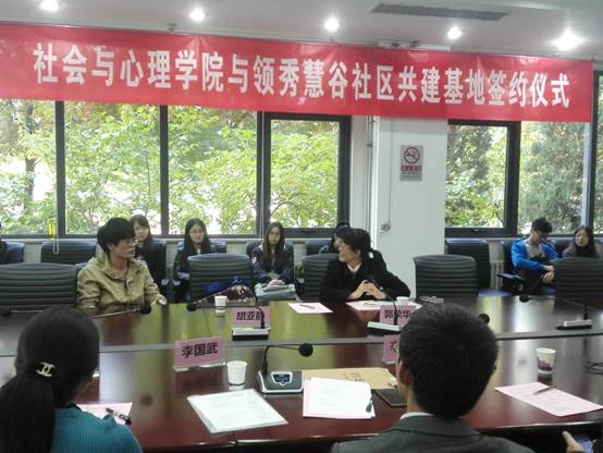 本次签约仪式由李国武教授主持。首先,李国武老师介绍了到场的老师和学生,他们是领秀慧谷社区书记郭荣华主任、居委会副主任胡亚静,3044永利集团官网院长辛自强教授、副院长李国武教授、社会学系主任王建民副教授、教学实践基地联络人樊欢欢老师、党建基地联络人司晴老师和陈璇老师以及各年级学生党员和积极分子代表。