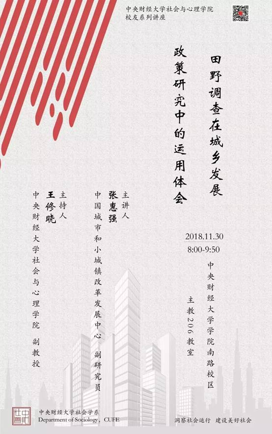 2018年11月30日早8:00-10:00,学院南路校区主教206教室,3044永利集团官网社会学系2018年度校友系列讲座,邀请到中国城市和小城镇改革发展中心副研究员张惠强老师,做了题为《田野调查在城乡发展政策研究中的运用体会》的精彩讲座。讲座由社会学系王修晓老师主持,社会学系艾云老师、2018级社会学本科全体新生,以及其他年级的部分研究生和本科生共60余人到场参与。