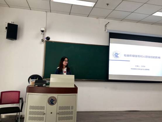 4月9日上午,永利集团官网2018级应用心理硕士研究生兰艺华同学在中财大厦二层案例4教室进行了题为《社会阶层信号对人际信任的影响》的学术汇报。