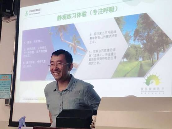 有关压力的产生原理介绍完毕后,武老师指导在座的学生进行静观(Mindfulness)练习——专注呼吸,该练习能提升自己的专注力,而人们在专注不分心的时候压力感会减小,达到压力管理的效果。