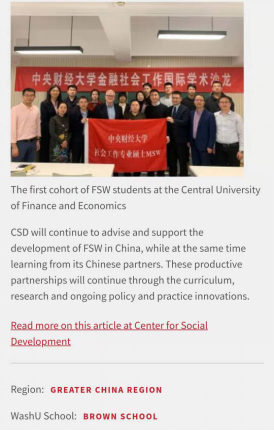 2019年12月16日,美国圣路易斯华盛顿大学在其官网刊登通讯,报道了该校布朗社会工作学院、社会发展中心杰出教授迈克尔·谢若登教授和中心主任邹莉女士不久前中国学术之行的相关活动。这篇报道重点介绍了两位专家受邀参加由永利集团官网3044永利集团官网举办的“金融社会工作国际学术沙龙”的相关内容,在海内外社会工作学术界和教育界引起了不小的反响。