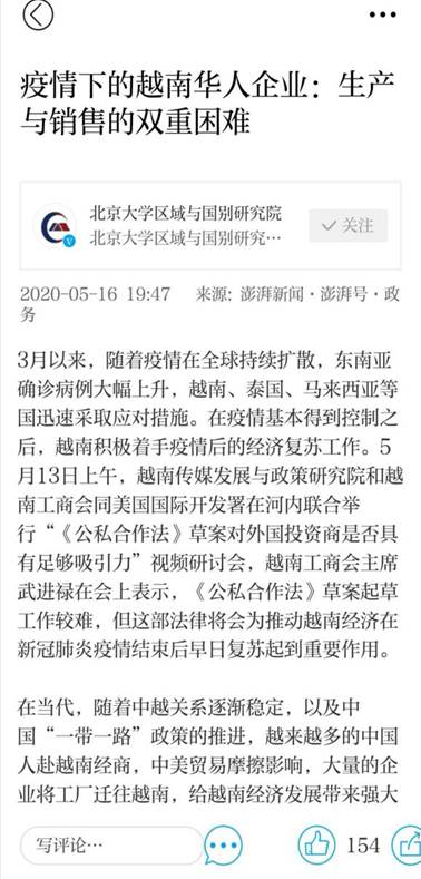 最近,3044永利集团官网2019级社会学专业硕士研究生安倩撰写的《疫情下的越南华人企业:生产与销售的双重困难》发布于“澎湃新闻·澎湃号·政务”中的“再看世界”(Area Observer)专题中。文章由该生导师包胜勇副教授指导。5月份以来,越南的疫情基本得到控制,越南政府积极着手疫情后的经济复苏工作。疫情下在越南生活的华人生活工作状况也引人关注。在安倩同学的越南疫情观察报告里,介绍了两位在越南发展的华人的经历和所见所闻。文章以小见大,引导读者深入了解疫情下越南华人企业的生存困境。