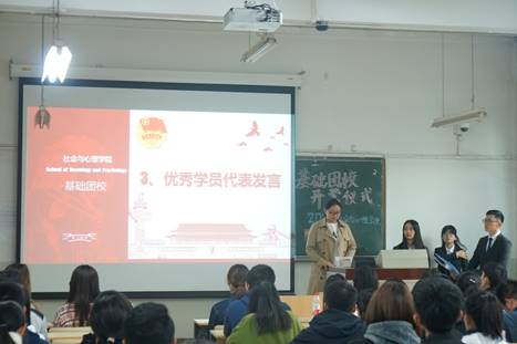 2017级基础团校优秀学生代表解琛学姐的发言更是让同学们感到团校的魅力所在。除了分享自己在基础团校的经历,她还告诫同学们,要自觉践行核心价值观,成长为能够担当重任、无愧时代的优秀青年。团组织是共产党的后备主力军,而基础团校正是调动同学们对团学活动的积极性,集趣味性与实践性于一体的活动。参与基础团校能让同学们在活动中思考知识,讨论策划,从而融入集体,提升能力,走出迷茫,成长为牢记党和国家使命的优秀共青团员。最后,她预祝同学们学有所成,今年基础团校取得圆满成功。