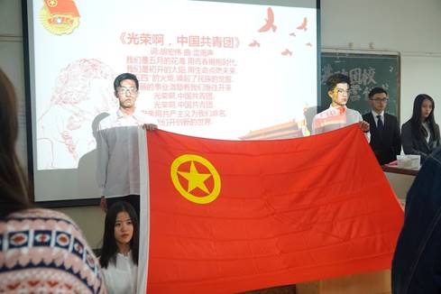 紧接着,仪式进行第二项,出团旗、奏团歌。两位团校同学代表庄严出旗,同学们集体起立,行注目礼,在激昂的《光荣啊,中国共青团》乐章中,回忆入团时的铮铮誓言,升腾起对团组织的荣誉感和使命感。正如团歌所唱,我们是五月的花海,初生的太阳,我们是新时代光荣的共青团员。