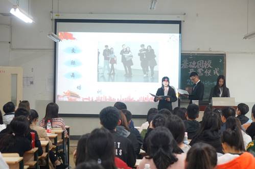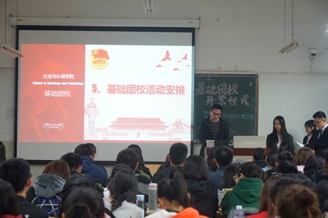 接下来,组织部部长兼基础团校办公室主任万造君学长为我们介绍了今年基础团校的课程安排与考核形式。本着提高同学们思想政治素养,调动基层团组织活力的理念,今年基础团校安排了职业规划与心理健康讲座,青马班、学科竞赛等方面的内容培训,团学知识竞赛等活动。另外,他还介绍了基础团校考核制度,通过考勤、展示、考试等检验,合格成员可以拿到结业证书,优秀成员可以获得优秀学员称号。发言最后,他告诉同学们,进入团校学习,要端正生活态度,树立正确的人生观价值观,严于律己,才能成为合格而光荣的共产党后备军。