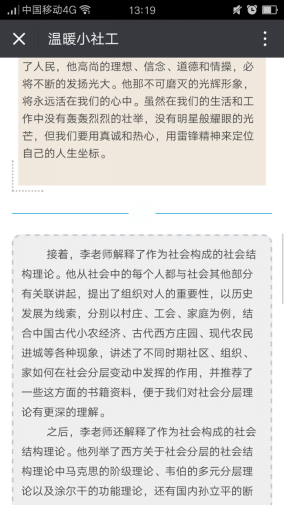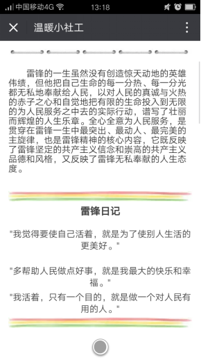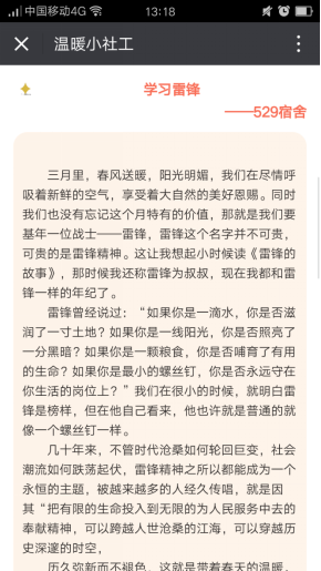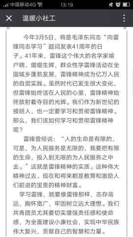 我们是听着雷锋的故事长大的,我们爷爷辈,父辈会跟我们说,我们接触的书籍会告诉我们,雷锋是一个像螺丝钉的人。所以,我们决定在三月里,学习雷锋精神。学校里的标语宣传着雷锋精神,社工15级的全体学生也以寝室为单位,阅读关于雷锋和雷锋精神有关的文章,学习雷锋精神。我再看有关关于雷锋的故事,真的时隔已久。我想起我小时候看过的《雷锋的故事》,像是传记一般,从他的出生到死亡。当我们再读完雷锋,我们的脑子里不仅是有雷锋的螺丝钉的精神,还有雷锋经典且振奋人心的语录。“如果你是一滴水,你是否滋润了一寸土地?如果你是一线阳光,你是否照亮了一分黑暗?如果你是一颗粮食,你是否哺育了有用的生命?如果你是最小的螺丝钉,你是否永远守在你生活的岗位上?”