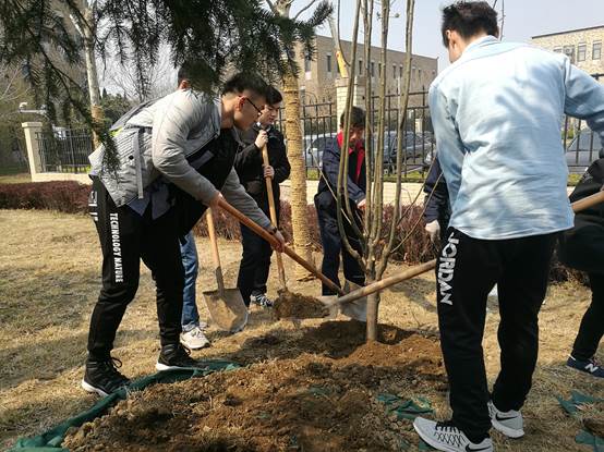 在活动过程中,同学们以党支部为单位分成小组,将树苗放在树坑中,挥锹铲土填入树坑,培实新土堆起围堰,再用水桶装水,慢慢地往树苗根部浇水,整个过程都洋溢着青春的活力和欢乐的气息。在植树的过程中,同学们不时地向一旁的师傅请教经验,进行小组间的小比赛。中午的植树活动沐浴着春日的阳光,在愉快的氛围中持续进行着。