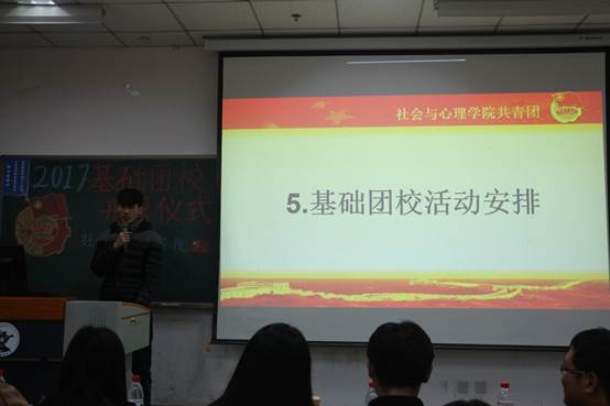 随后,组织部部长刘桂槟学长向同学们介绍了本期团学教育的活动安排和制度建设。首先,学长介绍了团组织将开展的团学课程:理论教学、芮+导师授课、就业规划讲座、知识竞赛、礼仪教学和交际舞会、十九大报告展示以及闭营仪式上的现场考核等活动。在制度介绍方面,学长提及了成绩统计、奖惩制度、请假流程、课堂纪律等方面。最后,学长提出三点要求:端正动机,切勿急功近利;严于律己,做党的后备军;积极反思,争取早日入党。