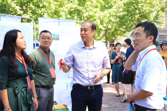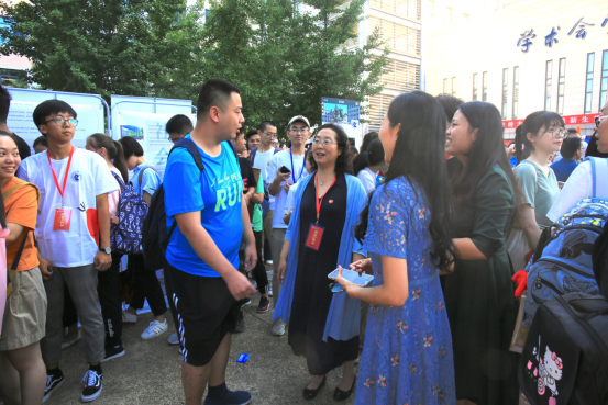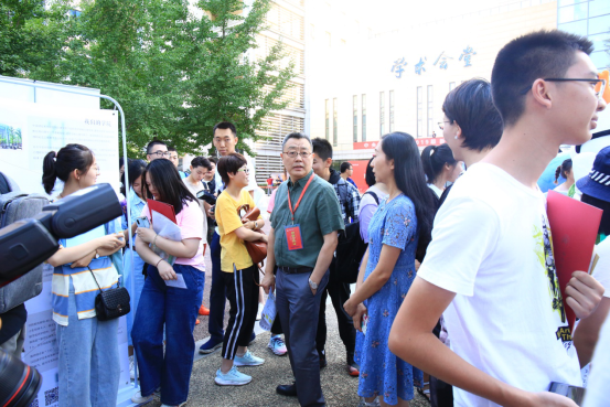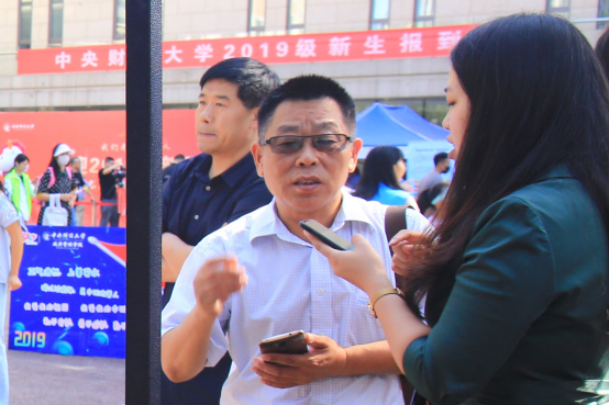 党委书记何秀超,校长王瑶琪,以及副校长孙国辉到场查看迎新进度,询问了迎新现场的状况。在了解了准备的新生礼物后,何秀超书记提出想要看一看礼物中的2019级社心院服,并对学院设计院服的心意表示赞同,也提出了学校也可以设计有中财特色的校服的想法。