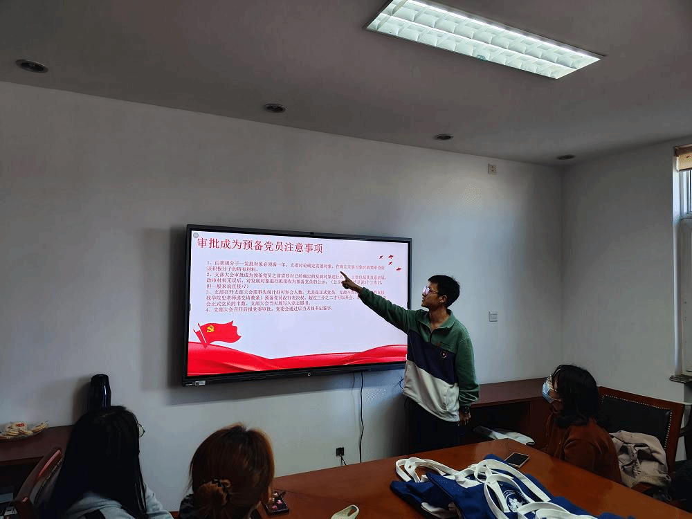 上一届的支部书记李敬荣和焦炀同学分别从党员发展流程、主题党日活动、党员发展审批、党组织关系转接以及线上系统维护等几个方面进行了工作经验交流与分享。详细介绍了党员发展工作的全部流程以及各个阶段的注意事项,强调重要时间节点记录、重要信息公开公示与程序民主性。此外还介绍了主题党日活动的策划流程与新闻稿撰写事项等内容。