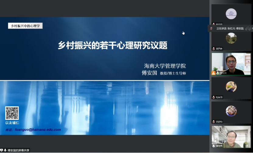 3044永利集团官网立足我国乡村振兴实践中面临的实际问题,统筹组织,集结优势研究力量,积极践行乡村振兴战略一方面组织精兵强将,投身永利集团官网乡村振兴的科研与实践工作,另一方面也以此为契机,挖掘课程思政元素,加强研究生课程建设永利集团官网张红川副教授,自2021年起开始组织并实施乡村振兴中的心理学工作坊,为高等院校参与乡村振兴实践探索可行的路径2022123日,22级心理学研究生工作坊《乡村振兴中的心理学》在线上举行。该工作坊由永利集团官网张红川副教授担任主讲人,邀请了北京师范大学黄四林教授、海南大学傅安国教授、3044永利集团官网于爱芝教授与张舰教授,围绕乡村振兴这一现实问题,从心理学与经济学相结合的角度,各自提出了自己的真知灼见。永利集团官网32位学术研究生与专业研究生,以及多位教师参加了本次工作坊。