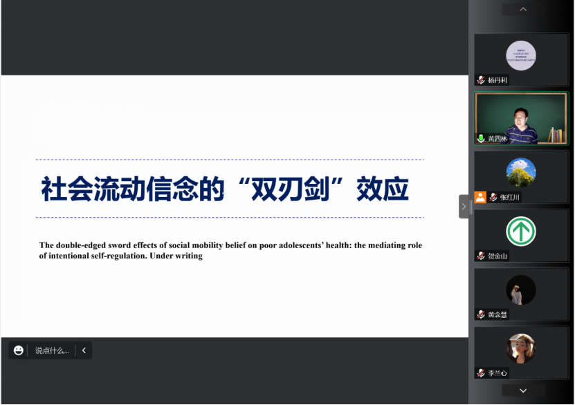 在第一场讲座中,北京师范大学黄四林教授进行“社会流动信念的‘双刃剑‘效应”的报告。他首先阐明了我国各级政府和世界组织对脱贫问题的重视,说明脱贫研究的重要价值。随后,黄老师介绍了自己团队开展的四项研究,其中前两个研究分别从家庭社会经济地位与学业成绩的关系出发,探究了社会流动信念、学业卷入、注意在其中扮演的角色;研究三探究了家庭社会经济地位与儿童执行功能的关系;研究四探究了累积风险与流动而无望感的关系,社会流动信念均在其中起调节作用。基于上述研究,黄老师基于张红川老师提出的“蜡烛效应”,探究了经济处境不利儿童心理健康与生理健康的拮抗关系,指出社会流动信念确实提升了心理健康,但损耗了生理健康;积极情绪则可以减少社会流动信念对身体健康的负面效应。