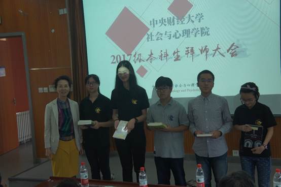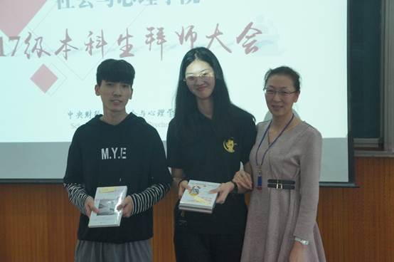 随后进入大会第三阶段,由陈璇老师主持颁奖典礼,为由学院微信公众平台“青春社心“承办的暑期专业知识有奖问答和留言赠书活动颁奖。在为期5天的有奖问答活动中,共有5位新生同学获奖,他们是王昱冰、陈依婷、徐传弟、阳明峰和葛乙平。在留言赠书活动中,于暑期分享自己与心理学的故事并获得好评最多的同学获得了赠书,并由心理16的刘桂槟同学和社会17的陈依婷同学两位作为学生代表领书。
