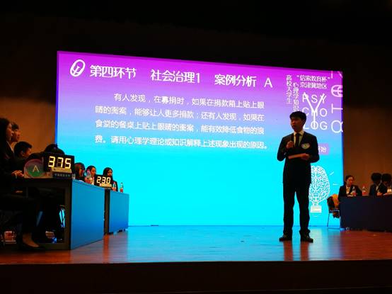 观众互动结束后,比赛进入第三环节——心理短剧。首先,每支队伍根据事先给定的心理学专业术语进行3分钟心理短剧表演,并由专业老师对该队表演打分。表演的队伍用惟妙惟肖的动作和语言表现了心理学术语,让场下观众对心理专业名词有了更直观的了解。在表演结束后,其余队伍需在题板上写下所猜测的该队所表演的心理学术语。猜对的选手淡然处之,猜错的选手毫不气馁,积极准备下一部分比赛。最后,其他队伍需作答表演队伍根据该心理学专业术语所设计多选题。三部分环环相扣,每部分得分相加为本环节最终得分。本环节综合考察选手们的心理学专业素养,同时以趣味表演的形式增加了心理学的趣味。