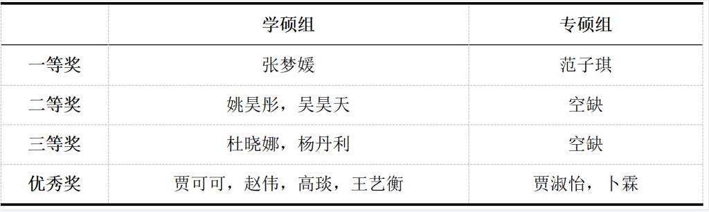 本次学术论坛分为学硕组和专硕组两个组别,其中学硕组有9名同学参与,参评教师为傅鑫媛副教授、李丹枫副教授和杜晓鹏老师;专硕组有3名同学参与,参评教师为于泳红副教授、马敏副教授和王英芊老师。在每位参赛选手口头报告之后,参评教师会依据内容进行提问,并给出相应的研究建议。本次学术论坛不仅是一场学术竞赛,更是学生和老师之间的思想互动,促进研究学习一体化的良性发展。