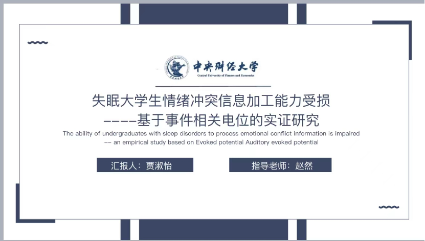 我国是一个高等教育大国,有四千多万大学生。由于需要应对来自社会各方面的压力,诸如高强度的学习与求知、变化的居住环境和生活方式、沉重的经济负担和复杂严峻的就业形势,大学生正在成为心理健康问题的高危人群。有数据表明中国大学生睡眠问题检出率为25.7%。贾淑怡同学通过神经电生理指标检测睡眠问题大学生情绪冲突信息加工能力受损情况,为临床检测与治疗提供了依据。