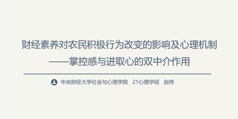 农民作为乡村建设过程中的治理与受益主体,其自身积极行为改变的动力是我国振兴乡村的关键。赵伟同学从内生动力角度出发,提出可以利用心理干预手段,以人力资本投资为内生动力外显载体,促进农民行为积极化。具体来讲,拥有更多的财经素养相关知识,可以增强农民的内生动力,提升农民在经济活动中的掌控感和进取心,助力乡村振兴。