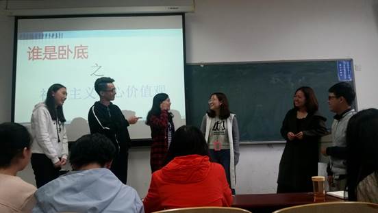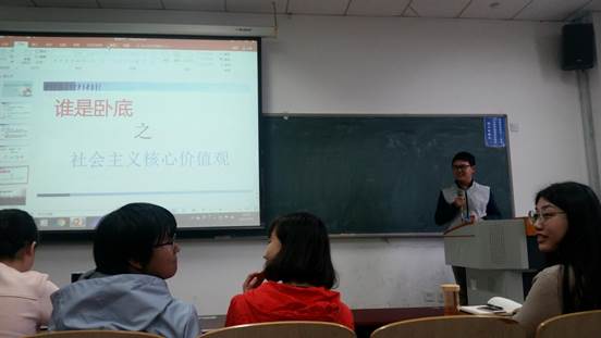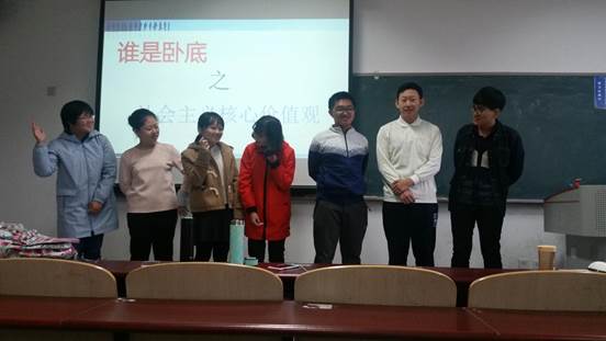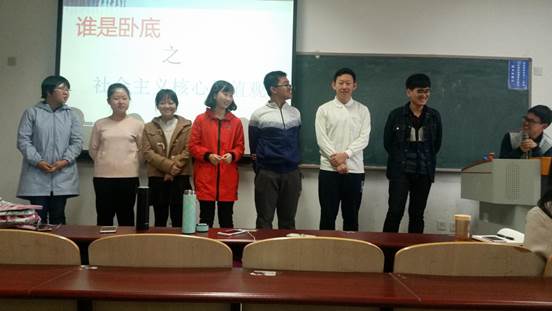 接下来,徐传弟同学主持了游戏环节,同学们共同参与了“谁是卧底”的游戏,通过抽取与社会主义核心价值观相近的词语,形成对比,体会它们之间的不同,这让我们更深刻的理解了核心价值观的内容。