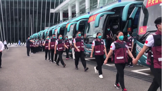 3月16日,应香港特区政府请求,一支由300人组成的内地援港医疗队经深圳莲塘口岸启程赴港,全力配合港府开展新冠病人救治工作。(视频截图)