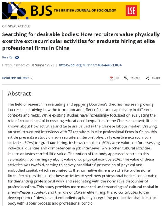 近日,永利集团官网3044永利集团官网任然讲师撰写的论文《寻求合意的身体:精英专业服务企业的招聘人员如何在校园招聘中评估体力型课外活动(Searching for desirable bodies: How recruiters value physically exertive extracurricular activities for graduate hiring at elite professional firms in China)》于《英国社会学杂志(British Journal of Sociology)》接收,现已在线上发表(https://doi.org/10.1111/1468-4446.13074)。
