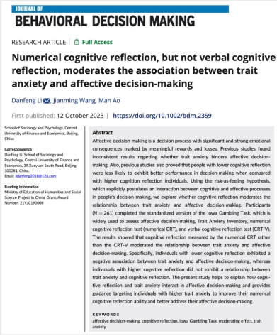 近日,永利集团官网3044永利集团官网李丹枫副教授的学术论文“Numerical cognitive reflection, but not verbal cognitive reflection, moderates the association between trait anxiety and affective decision making”在行为决策领域国际权威期刊Journal of Behavioral Decision Making上发表。论文在线链接: https://doi.org/10.1002/bdm.2359。